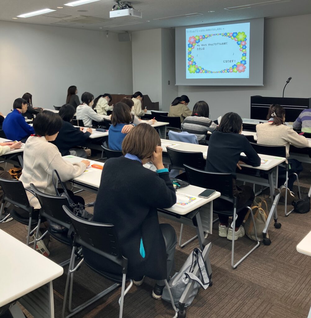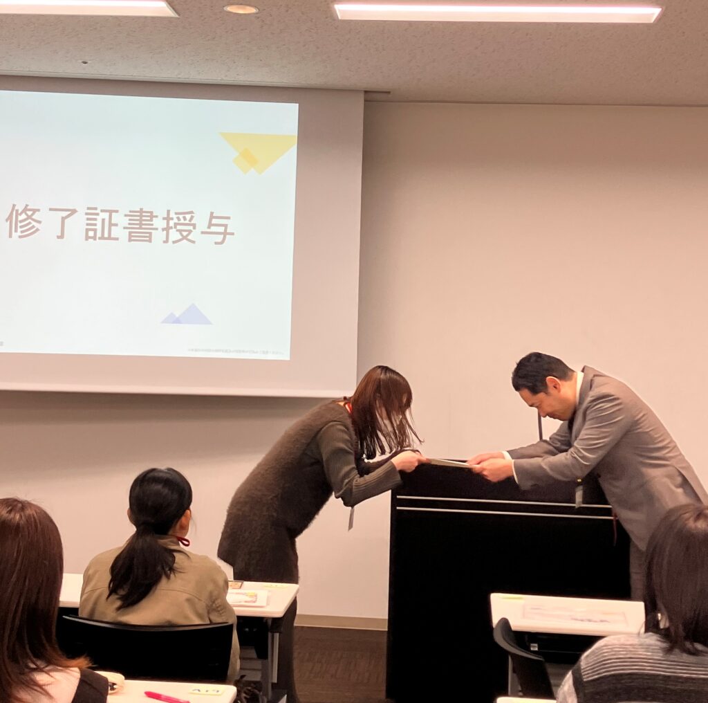 ワーク後は修了式を開催し、これまでの努力と強い意志の証となる「修了証書」をお一人おひとりに手渡ししました。授与時には、会場全体に「なりたい未来のわたし」を宣言。仕事への意欲や家庭での目標、人生の歩み方など、多様な宣言が聞かれました。